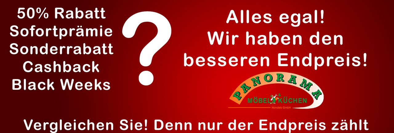Bei Panorama Möbel bekommen Sie garantiert den besten Preis! Darauf können Sie sich verlassen. Finden Sie innerhalb von 30 Tagen ein günstigeres Angebot mit identischer Leistung in einem anderen stationären Möbelhaus oder Küchenstudio, erstatten wir Ihnen die Differenz. Unser Versprechen an Sie!